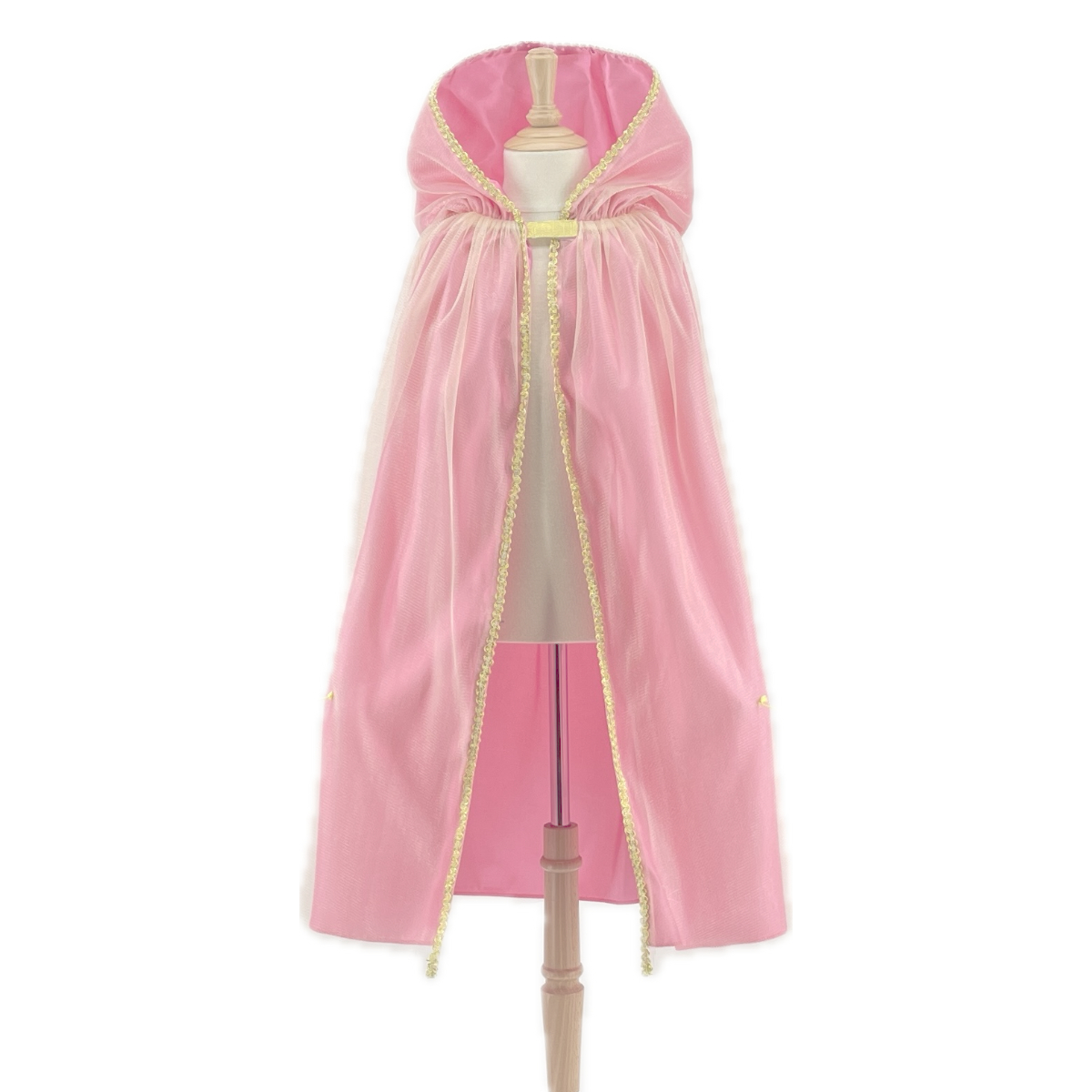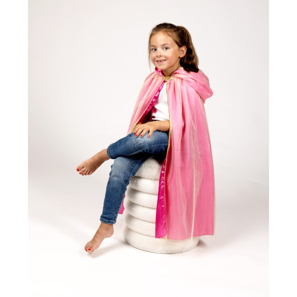 Cape avec capuche en organza, doublée de tissus satin rose et croquet couleur dorée. taille unique pour enfants de 3 à 10 ans, dimension 76 cm