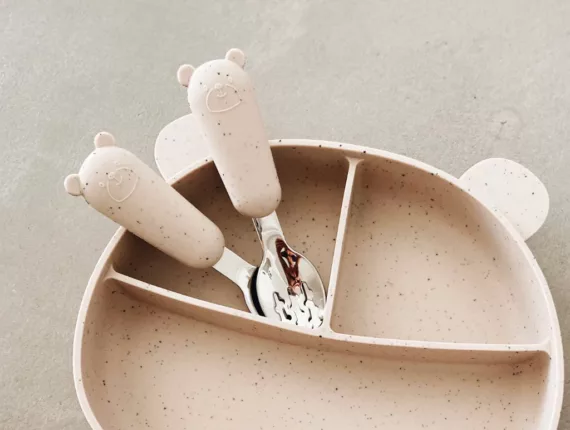 Notre cuillère est en acier inoxydable avec un support en silicone. Apprendre à se nourrir est une étape importante du développement.