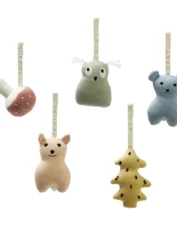 Partez à la rencontre de Max l’ours, Vera la renarde polaire, Sus la chouette, l’arbre et le champignon sortis de la forêt Edvin. Un ensemble pour portique de cinq pièces en jersey de coton doux. Deux des animaux produisent un tintement discret. Conçu pour s’intégrer à notre portique bébé tissu ou aux portiques en bois. Faciles à attacher avec le velcro. À placer partout où bébé a besoin de s’amuser.