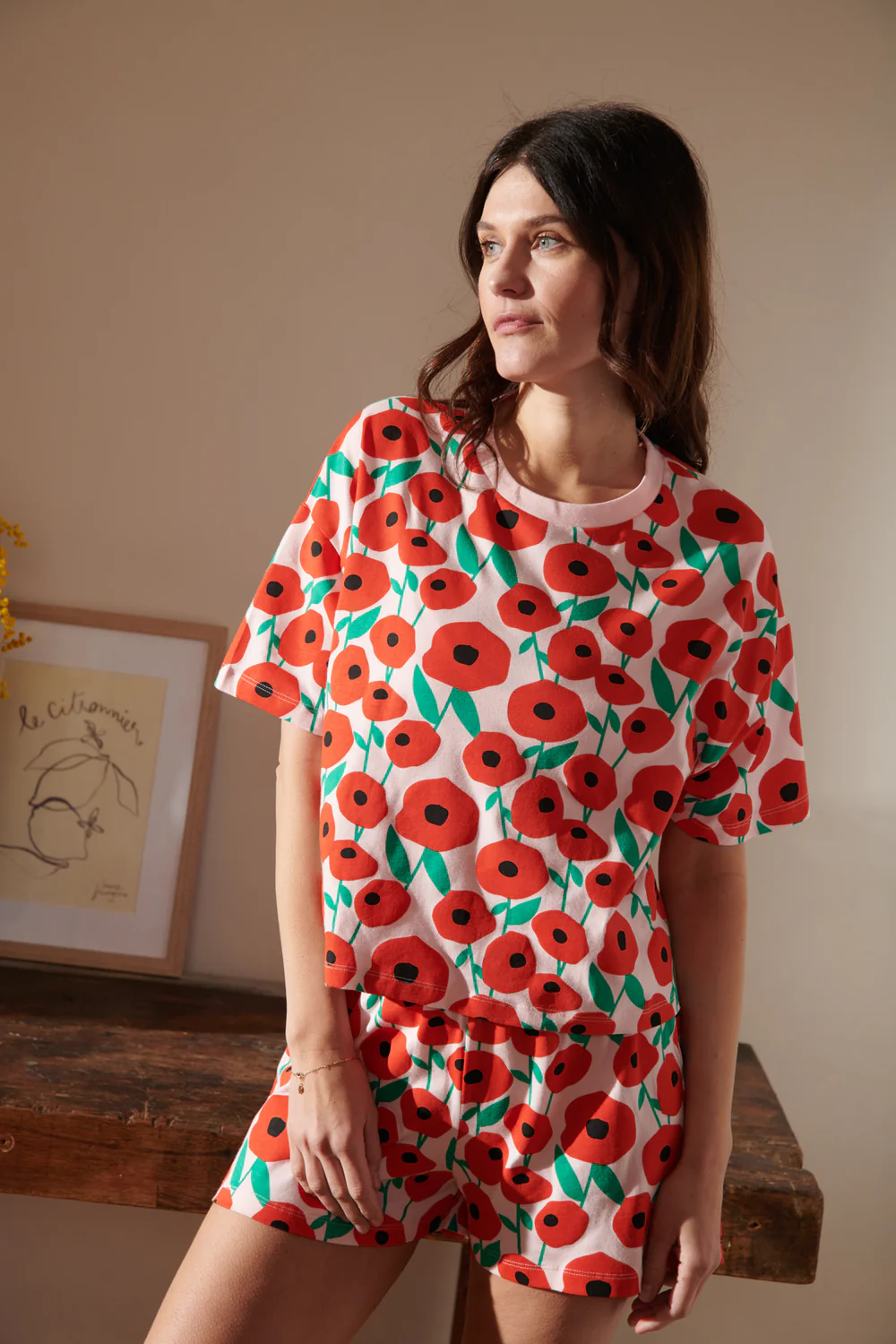 ☁️ Un t-shirt oversize à la coupe parfaite (ni trop grand, ni sac à patates), un short bien pensé (ni trop court, ni trop long), et le tout en coton bio bien épais pour éviter l’effet chiffon après une nuit de roulades… ou un marathon de séries.