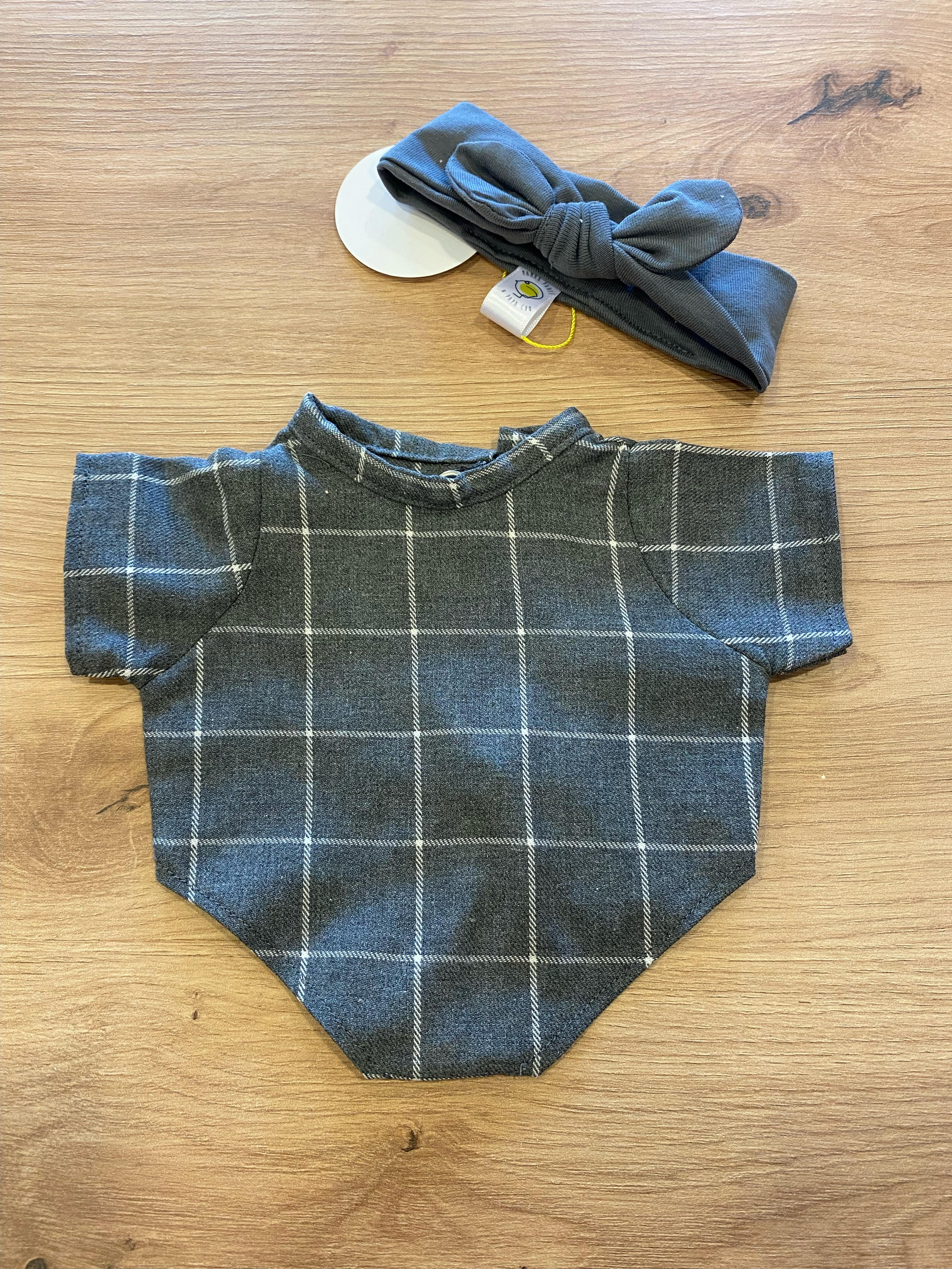 Barboteuse grise à carreaux et bandeau uni.